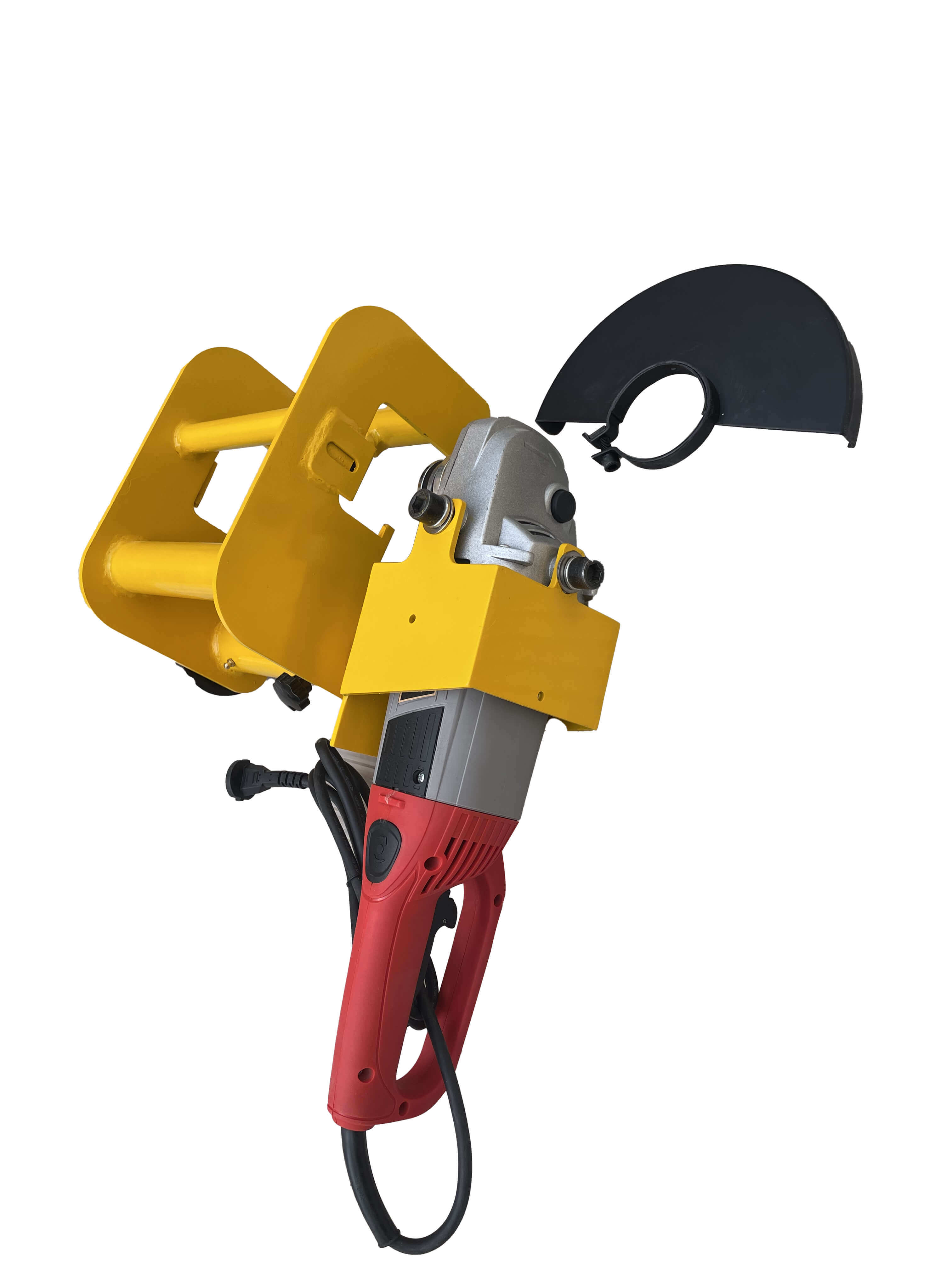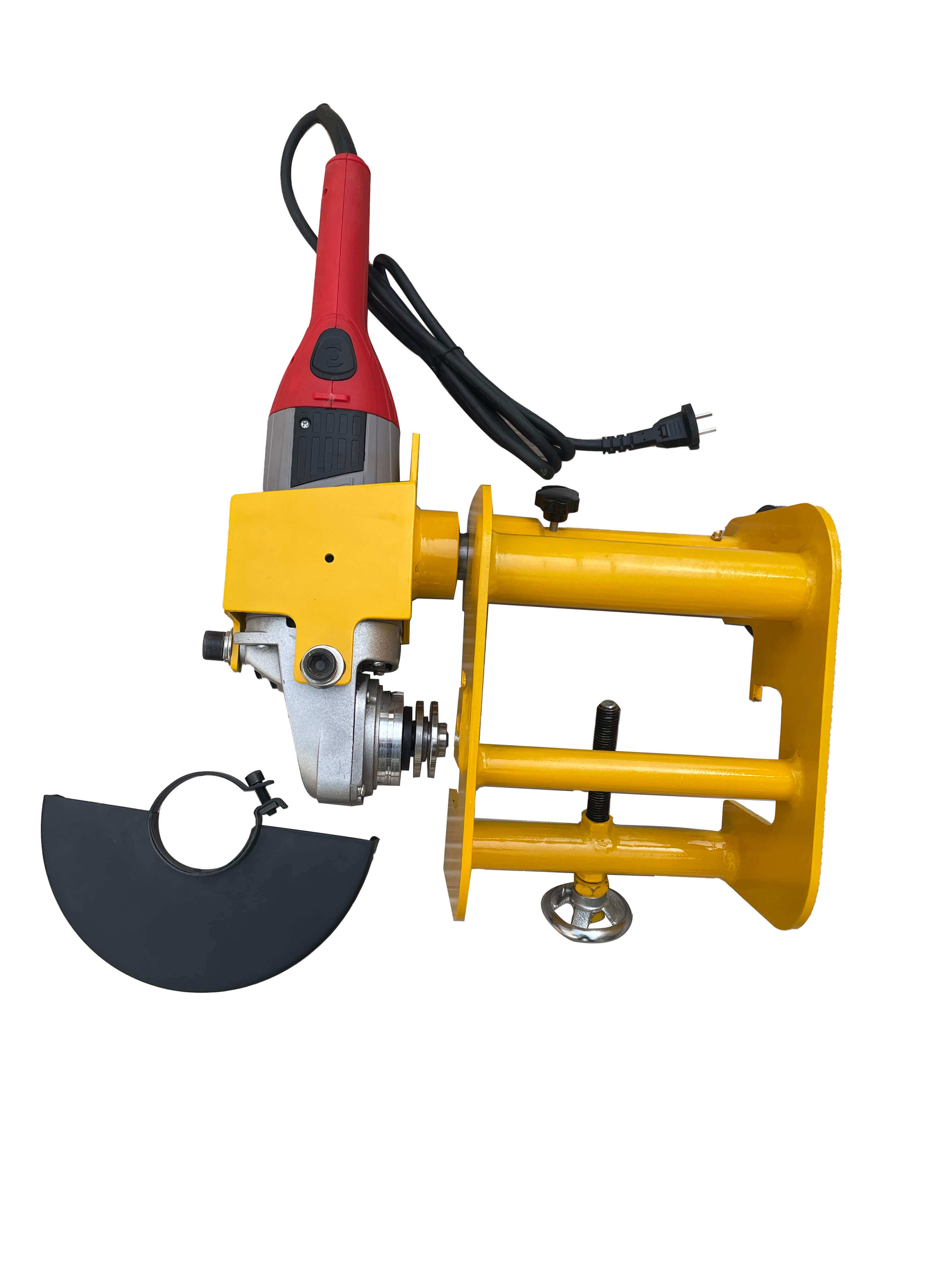 2、 将打磨机装卡在钢轨上。注意:卡具的顶面和侧面一定要与钢轨的顶面和轨鄂靠近,旋转定位手轮使定位螺杆与钢轨顶紧确保砂轮端面与钢轨轴线尽可能垂直。